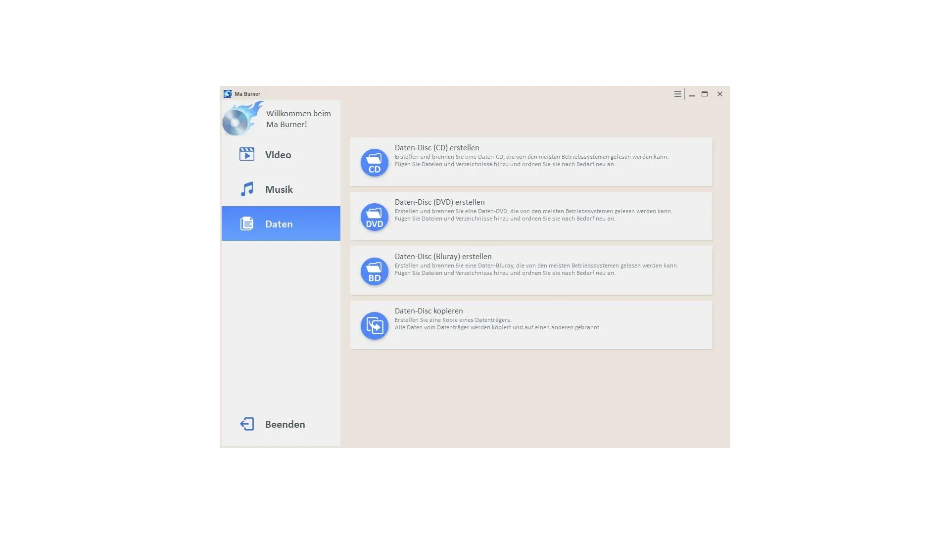 Audio-, Daten-CDs/DVDs und Blu-rays erstellen und brennen.
