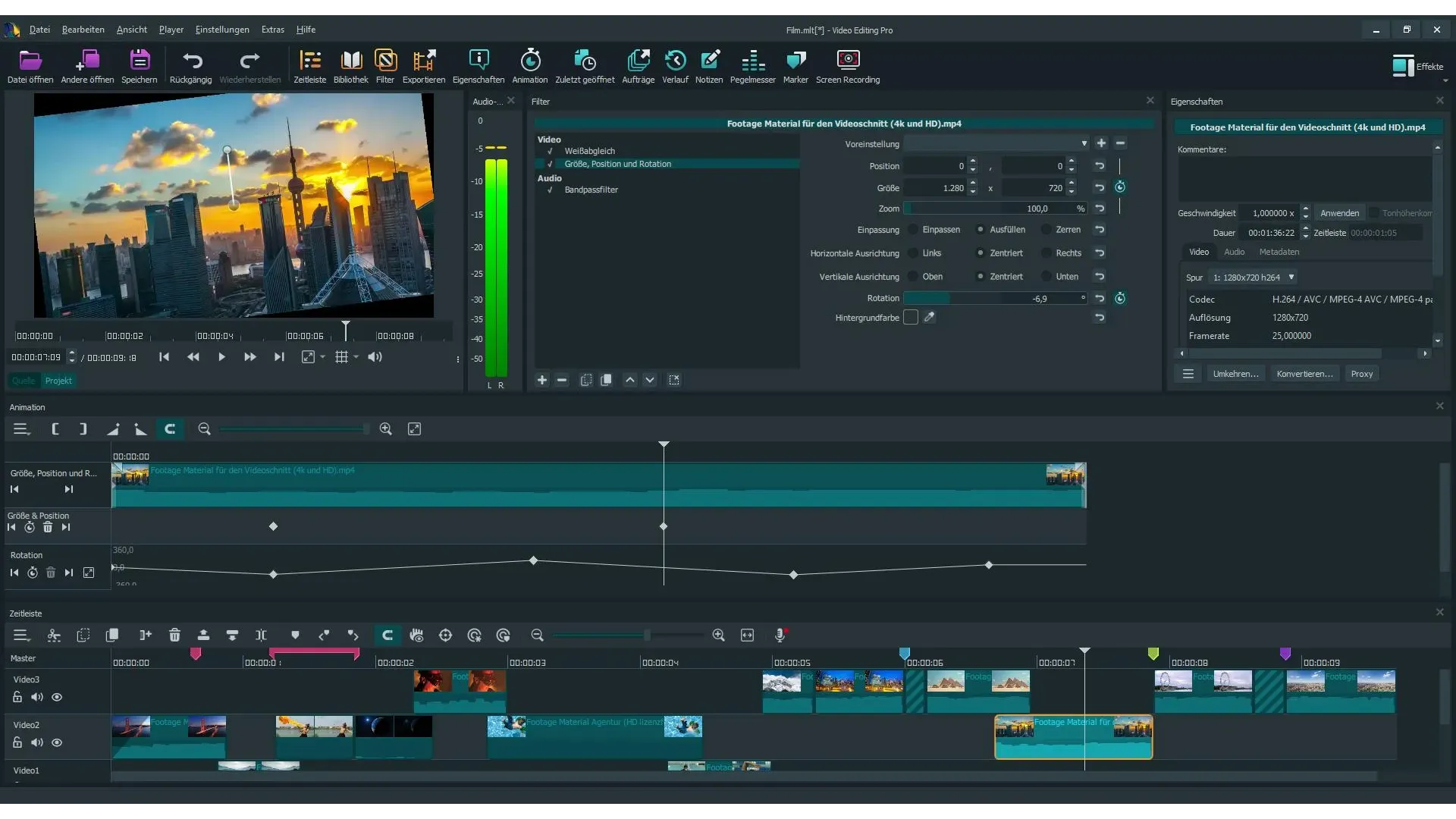 - Verleihen Sie Filtern, Effekten und Parametern Dynamik und Bewegung mit Hilfe von leistungsstarken Keyframe-Animationen.