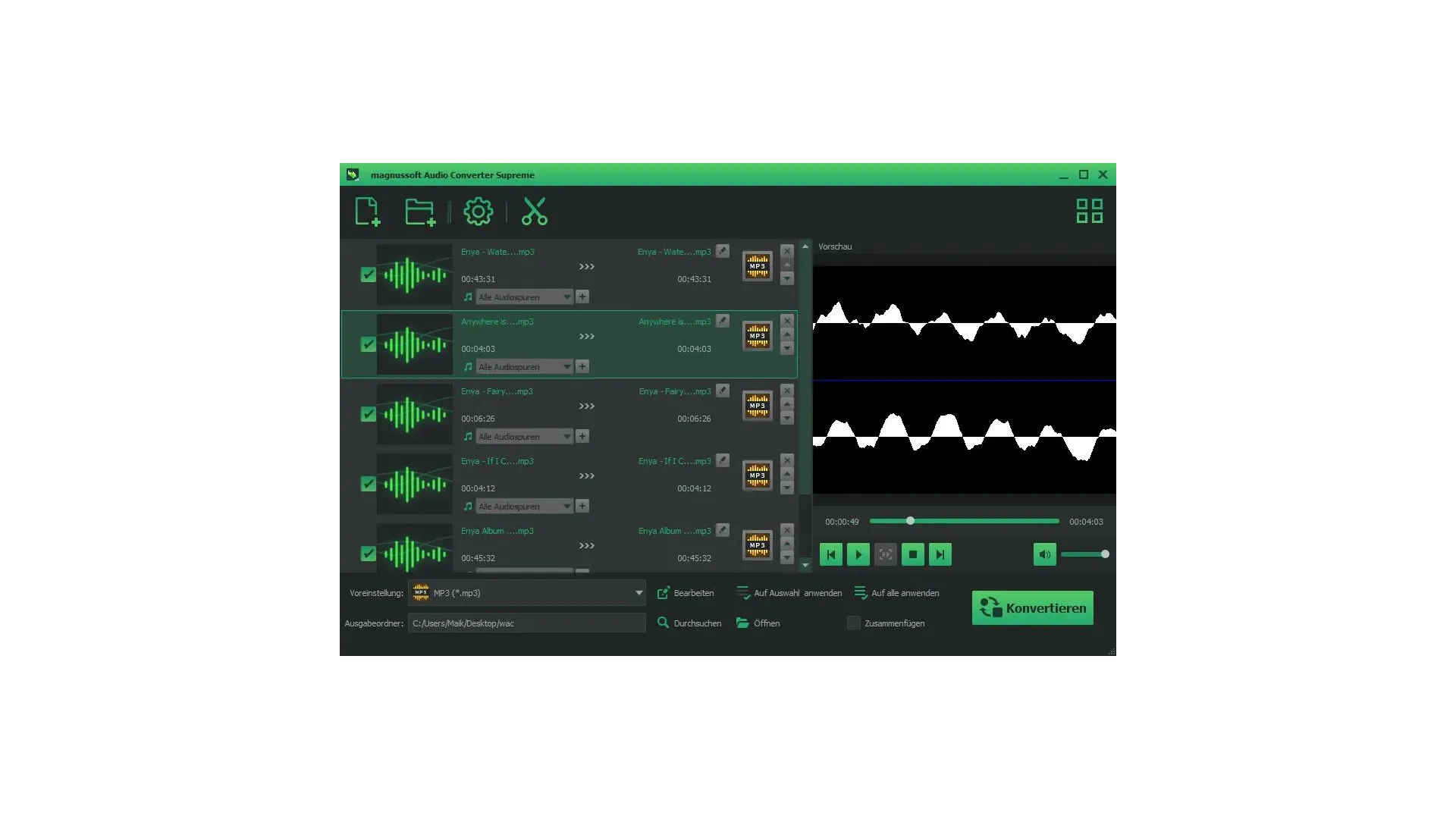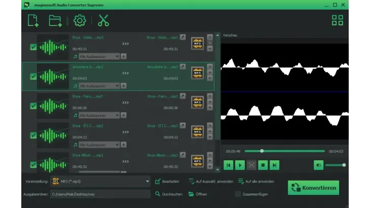 Ein leistungsstarker Audio-Konverter, der Ihre Musiktags beibehält, Audiodateien von DVDs und Videodateien extrahiert und mehrere Dateien gleichzeitig mit umfangreichen Einstellmöglichkeiten konvertiert.