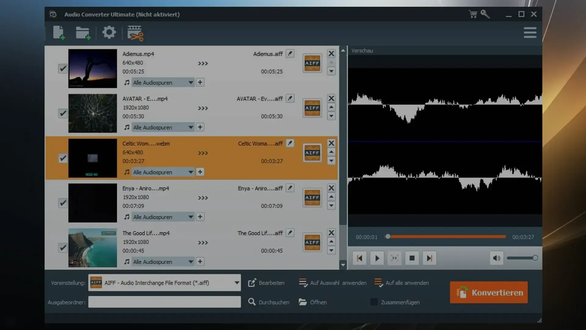 Ein leistungsstarker Audio-Konverter, der Ihre Musiktags beibehält, Audiodateien von DVDs und Videodateien extrahiert, vor der Umwandlung anhört und mehrere Dateien gleichzeitig mit umfangreichen Einstellmöglichkeiten konvertiert.